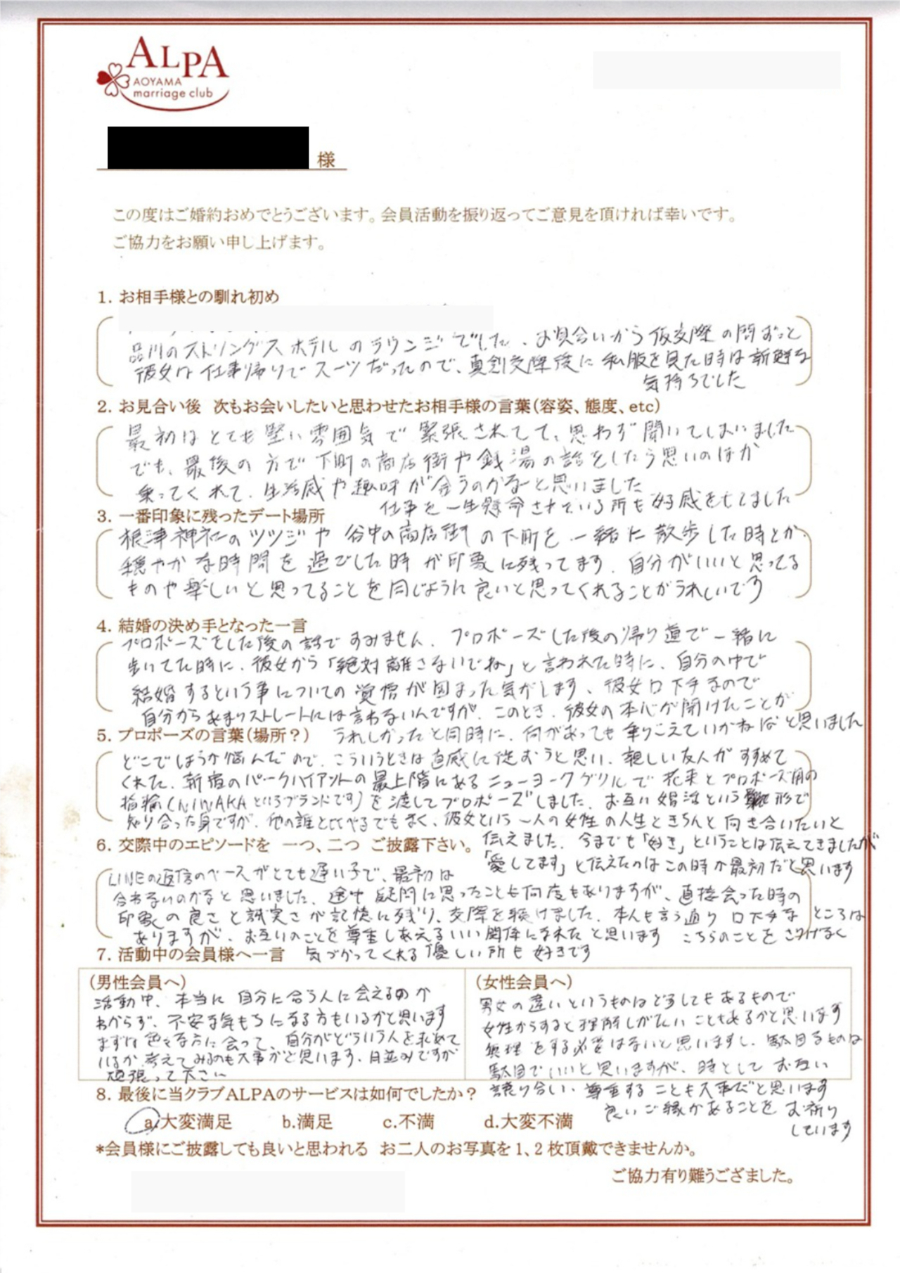 活動中、本当に自分に合う人にめぐり逢えるのか分からず、不安な気持ちになると思いますが、まずはいろいろな方と逢い、自分がどういう人を求めているのか考えてみることが大事だと思います。譲り合う気持ちと相手を尊重することを婚活を通して学びました。