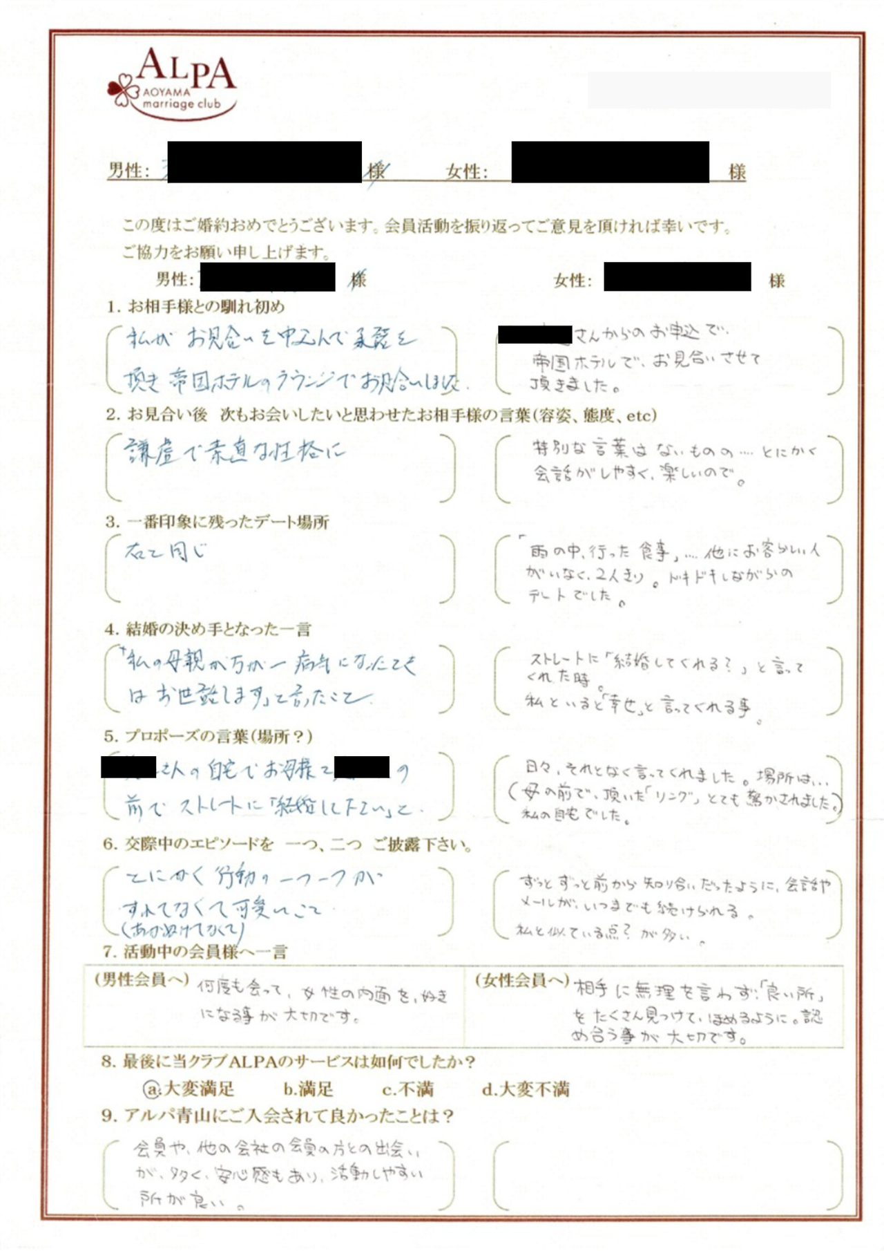 行動の一つ一つが擦れてなくて可愛く、私の母の前で「お母さまが万が一、ご病気になった時は、私にお世話をさせてください」と言ってくれた時にとても嬉しく、この女性と結婚しようと思いました。