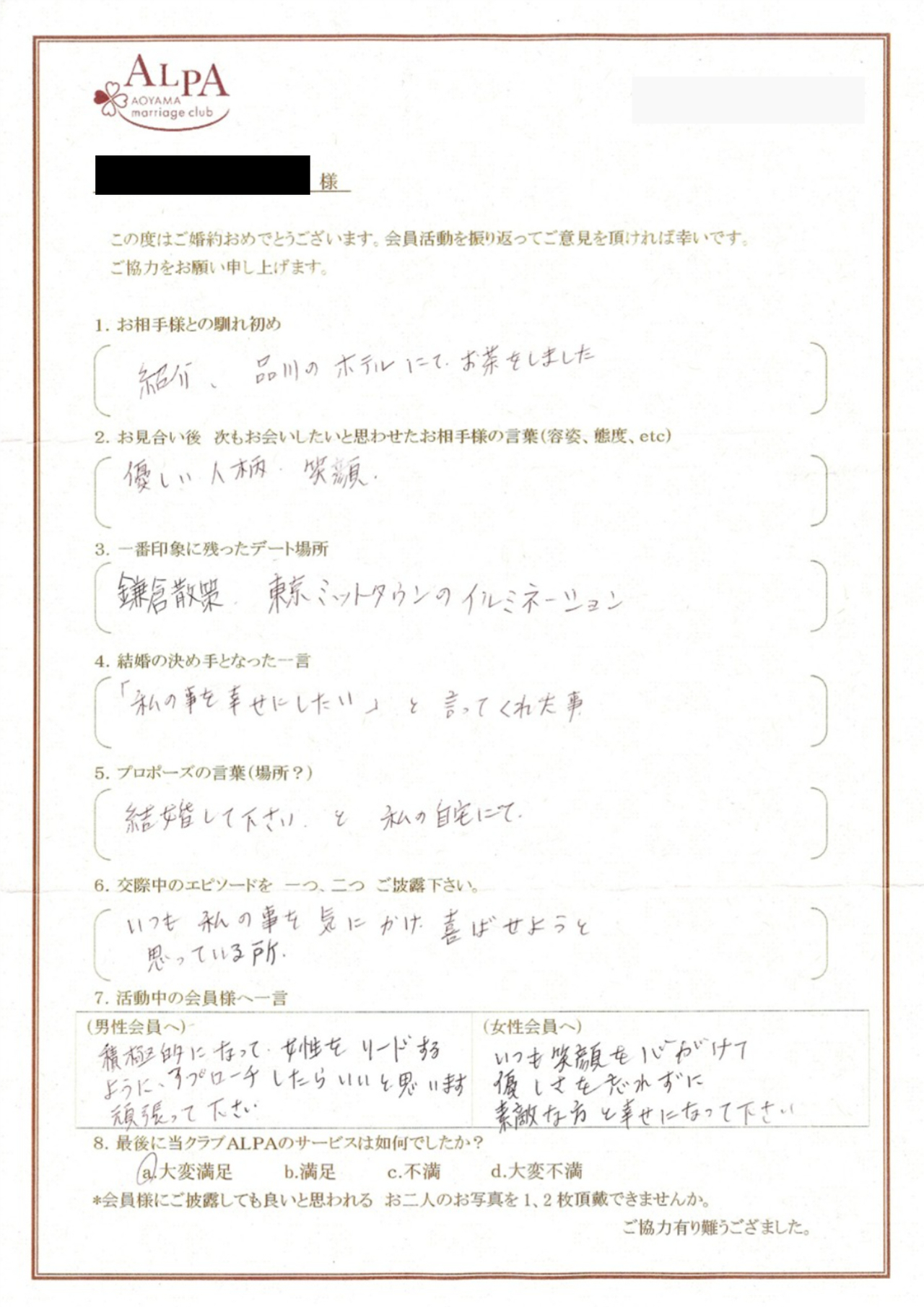 また、私の自宅の前で「結婚して下さい」と言ってくださったことです。