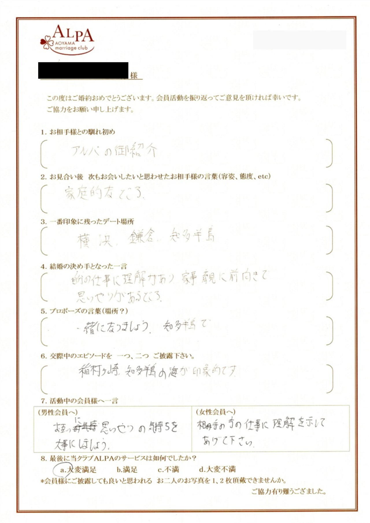 早く家庭を双方で持ちたいことや、家族を大切にしそうなご様子がお話しから伺えるかただったことと、会話がとても合うかただったので、またお逢いしたいと思いました。